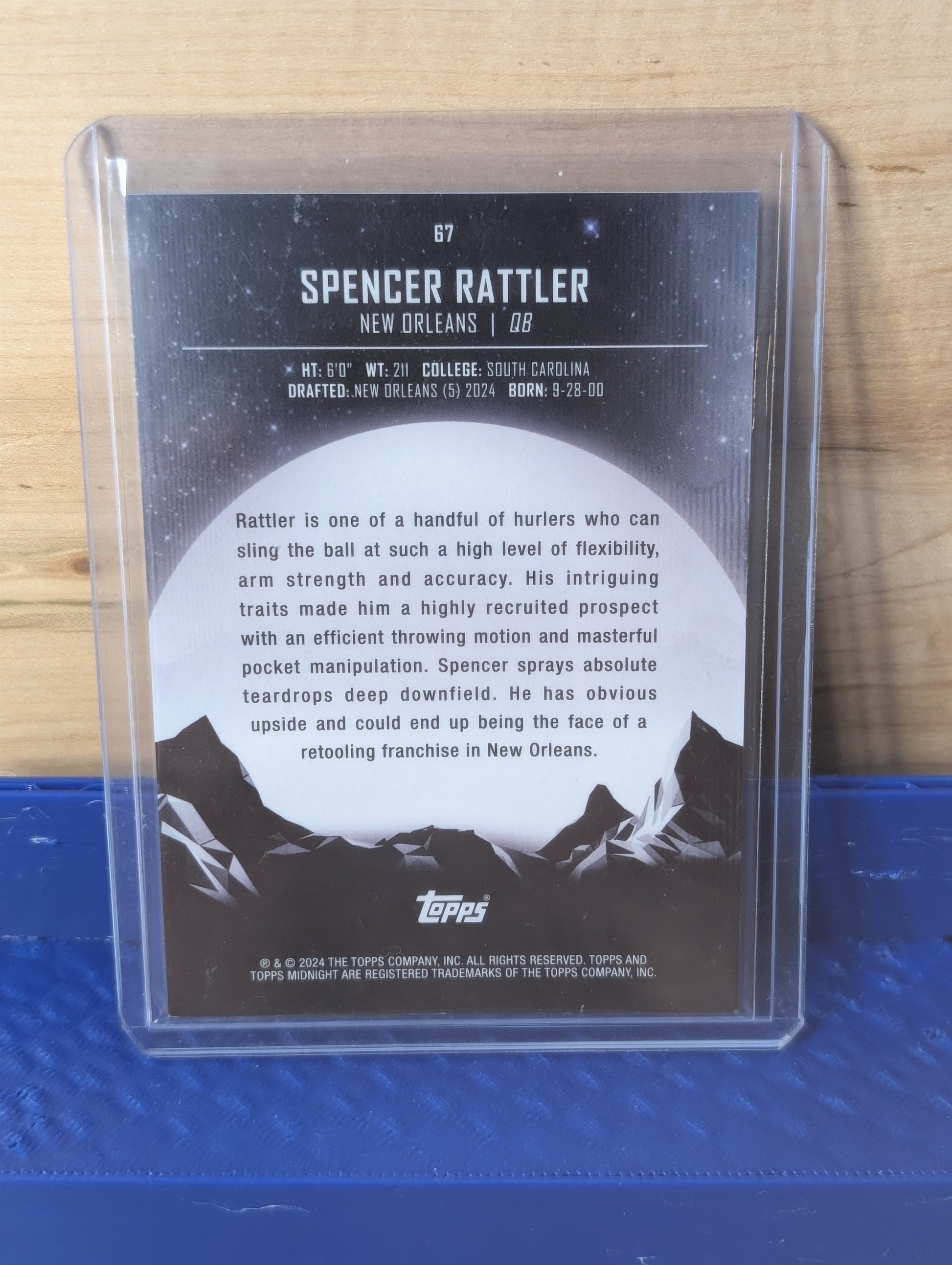 | Card 2 | 2024 Topps Midnight Football | Spencer Rattler (RC) | #67 (Rookie Card) | Serial Numbered Parallel | Numbered /149 (Specific Parallel not stated, but commonly "Morning" or similar) |